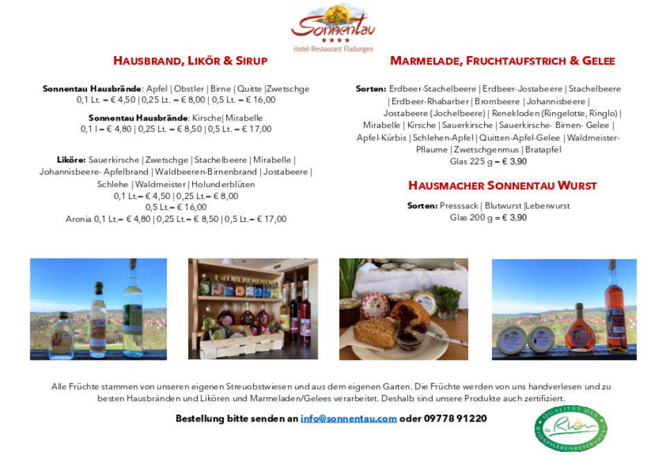 Unsere selbsthergestellten Marmelanden, Hausbrände und Liköre schicken wir Ihnen nach Hause. Lecker waren sie schon immer, doch nun sind sie noch als Rhönprodukte von der Rhön GmbH zertifiziert.