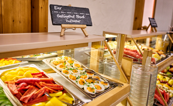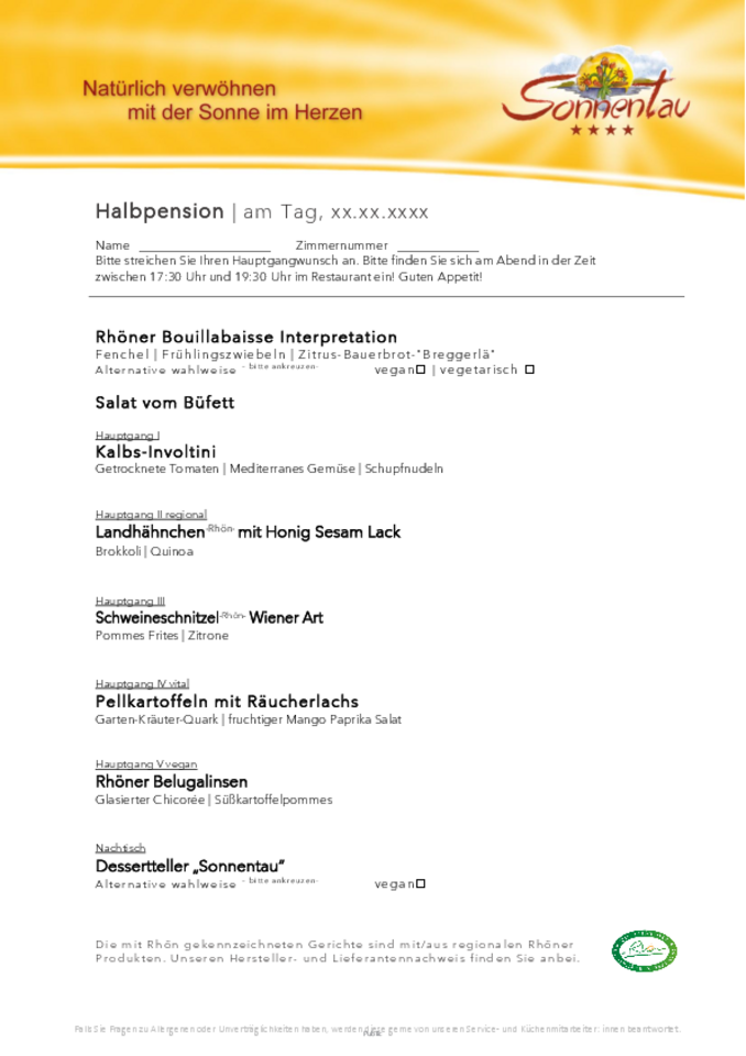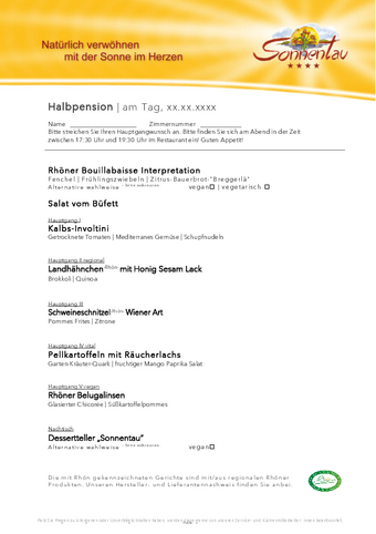 Entdecken Sie unsere täglich wechselnde Halbpensionskarte. Wir legen besonderen Wert auf die Vielfalt aus Fleisch- und Fischgerichten sowie auf vegetarische und vegane Speisen.